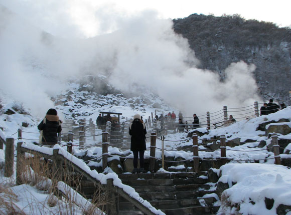온통 하얗게 뒤덮인 아시노코를 다시 한번 되새기며 향한 곳은 오와쿠다니. 곳곳에서 흰 연기가 피어오르고 진한 유황가스가 가득한 오와쿠다니는 3천여년 전에 이미 두차례에 걸쳐 화산이 분화한 곳. 670m가량의 산책로를 따라 걸으며 전경을 감상할 수 있다. 날씨가 나쁘거나 가스 분출이 심한 날은 출입이 금지되기도 한다고.