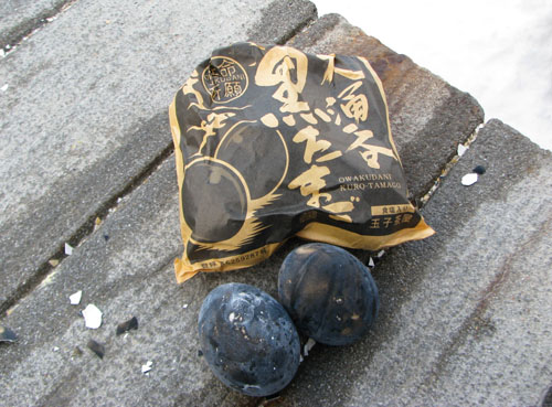 뭐니뭐니해도 오와쿠다니의 명물은 구로타마고(검은 달걀). 온천물에서 익혀서 겉이 검게 변한 달걀은 담백한 맛도 좋지만 하나를 먹을 때마다 7년씩 수명이 길어진다는 속설이 있으니 믿거나말거나 하나쯤은 맛보는 센~스.