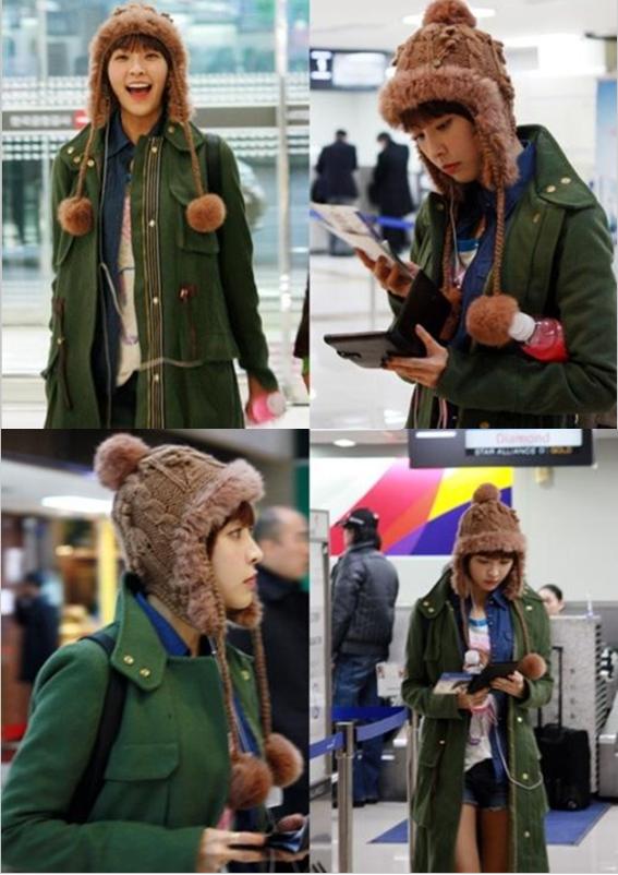 정유미는 공항패션으로 짧은 핫팬트와 카키색 코트를 매치해 발랄하고 따뜻한 느낌을 준다.