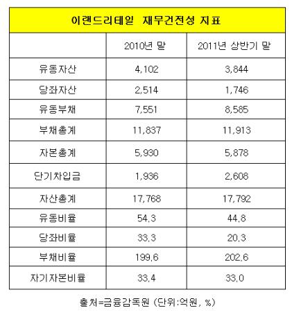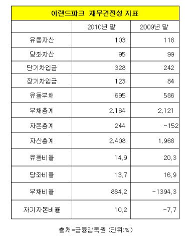 이랜드 파크의 유동자산은 2009년 말 118억원에서 2010년 말 103억원으로 줄었다. 반면 유동부채는 2009년 말 586억원에서 2010년 말 695억원으로 크게 증가했다.