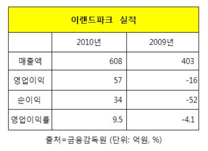 이랜드파크의 2010년 매출액, 영업이익, 순이익은 각각 608억원, 57억원, 34억원에 그쳤다. 2009년에는 아예 영업이익과 순이익이 적자행진했다.