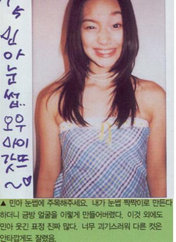 이 사진에서 신민아는 지금과는 사뭇 다른 익살스러운 표정으로 소녀의 모습을 보여준다.