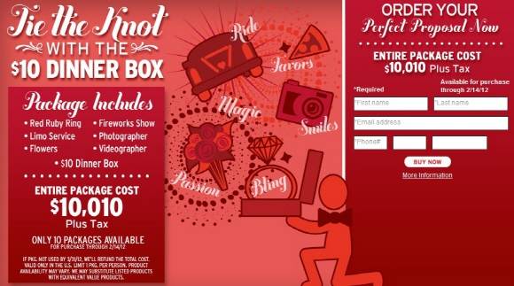 이어 이 특별한 피자는 피자 박스 안에 포함된 붉은 루비 반지를 이용해 깜짝 청혼을 할 수 있고 리무진 서비스, 불꽃놀이 이벤트, 프로포즈의 순간을 영원히 기억할 수 있는 사진 및 동영상 촬영 서비스가 함께 제공된다고 전했다.