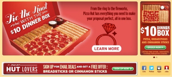 식사와 반지 및 꽃다발 증정, 다양한 이벤트 서비스로 특별한 프로포즈를 할 수 있다는 것이 업체 측의 설명이다.(사진-미국 피자헛 홈페이지)