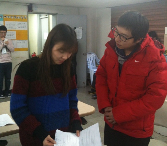 사진 속 정범균은 대본을 보는 신보라 앞에서 두 손을 공손히 모은 채로 신보라를 보고 있다.