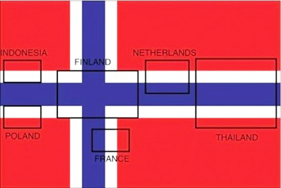 사진은 노르웨이 국기의 사진이 담겨있는데 노르웨이 국기 곳곳에 검은색 네모 테두리로 다른 나라의 국기를 표시해놨다.