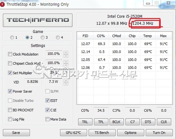 확인결과 3D 게임이나 그래픽 작업을 실행할 때 원래 CPU 클럭(1초당 CPU 내부에서 몇 단계의 작업이 처리되는 지를 측정한 컴퓨터의 속도 단위)인 2.5Ghz로 작동하지 않고 1.2Ghz 정도 수준으로 작동하는 것이 문제였다.