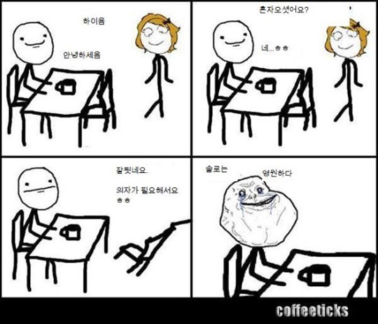 최근 한 온라인 커뮤니티 게시판에는 ‘혼자 오셨어요?’ 라는 제목으로 4컷 만화가 공개됐다.