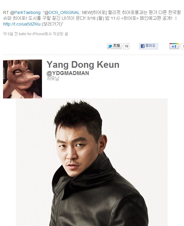 한편 양동근은 지난 10일 자신의 트위터를 통해 "NEW[히어로] 헐리웃 히어로들과는 뭔가 다른 한국형 슈퍼 히어로! 도시를 구할 질긴 녀석이 온다! 3/18 (월) 밤 11시 <히어로> 메인예고편 공개!"라며 자신의 드라마를 소개하기도 했다.