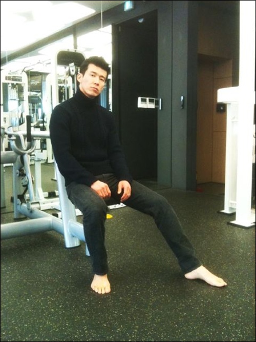 사진 속 션은 검은색 티셔츠를 입고 맨발로 운동기구에 앉아있다.