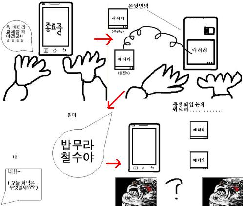 만화 내용은 휴대폰 배터리 교체를 위해 뒤쪽 커버를 열고 배터리를 교체할 준비 중 한 눈을 팔아 어느 배터리가 충전이 되어있는 것인지 헷갈린 상황을 나타내 많은 네티즌들의 공감을 불러일으키고 있다.