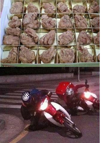 이들은 음식이 식기 전에 빨리 배달하기 위해 빠른 속력으로 질주하다보니 마치 오토바이 몸체가 땅에 닿을 듯 아찔한 모습으로 시선을 사로잡았다. (사진-온라인커뮤니티)