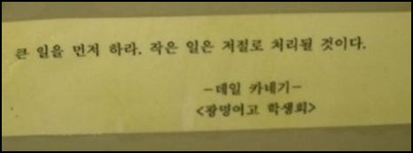 URL복사 기사공유하기 스크랩 프린트 메일보내기 글씨키우기 한 여자고등학교에 붙은 화장실 명언이 화제다. 최근 한 온라인 커뮤니티에는 '진정한 화장실 명언'이라는 제목으로 한 여고 학생회가 교내 화장실에 붙인 문구가 게재됐다. 문구는 데일 카네기의 명언인 '큰 일을 먼저 하라. 작은 일은 저절로 처리될 것이다'는 내용이다. 이 게시물을 접한 네티즌들은 "화장실에 딱 맞는 명언일세" "큰 것을 보면 작은 것은 저절로ㅋ" "센스만점이다" 등 재밌다는 반응을 보였다.(사진-온라인 커뮤니티) 저작권자 © 소비자가 만드는 신문 무단전재 및 재배포 금지 온라인 뉴스팀 다른기사 보기 URL복사 기사공유하기 주요기사 G마켓, 도용 의심 사고 피해고객에 선제적 보상 실시 엔씨소프트, 아이온2 업데이트...PvP 온·오프 모드 추가, '시공의 균열' 입장 인원 2배 늘려 현대차·기아, 자율주행 모빌리티 로봇 플랫폼 ‘모베드’ 최초 공개 동국제강그룹, 2026년 임원 인사 단행...글로벌영업담당 신설 SK하이닉스, 350억 달러 '수출의 탑' 수상…수출 지역 미주·유럽·아시아로 다변화 수입차 11월 판매 2만9357대, 23.4%↑...베스트셀링카는 '모델 Y'