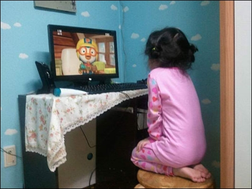 신께서 오셨습니다 사진 속에는 분홍색 옷을 입은 여자 아이가 무릎을 꿇고 어린이들이 좋아 하는 만화 케릭터 뽀로로의 등장 장면을 뚫어져라 쳐다보고 있다.