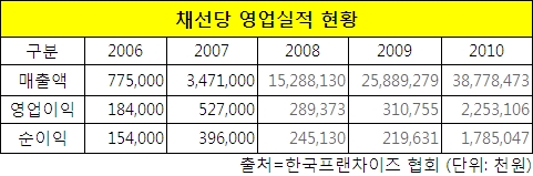 샤브샤브 전문점 채선당은 ‘다영F&B’가 운영하는 외식브랜드로 2004년 12월 첫 가맹사업을 시작했다. 이후 꾸준히 매출과 가맹점 수를 늘려가 2008년 111개였던 가맹점 수는 2009년 135개, 2010년 200호점을 돌파했다. 지난해 말 270개 점포를 돌파하며 회사 이름도 ‘채선당’ 바꿨다.