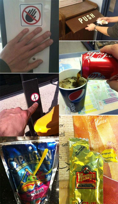 사진에는 ‘이곳에 손을 대지 마시오’라는 금지 표시가 돼 있는 곳에 보란 듯이 손을 댄 모습, PUSH라고 적힌 쓰레기통 입구를 밀지 않고 당겨서 여는 사람, 빨대 꽂는 자리가 엄연히 있음에도 다른 곳에 빨대를 꽂은 모습, 펩시콜라 종이컵에 코카콜라를 담는 모습 등이 담겨 있다.