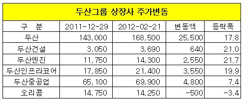 그나마 두산그룹은 최근 주가가 상승세를 타고 있는 것에 한숨 돌리고 있다. 올해 들어 주가가 3.4% 하락한 오리콤을 제외하고, 두산그룹 5개 상장사들은 최저 7.4%, 최고 21.7% 주가가 뛰었다.