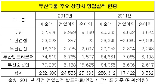 두산은 지난해 매출액 4조원을 돌파했지만 영업이익과 순이익은 2010년에 비해 반토막 수준이다. 두산건설은 지난해 영업손실액 2천700억원, 순손실액 2천900억원으로 적자전환 됐다.