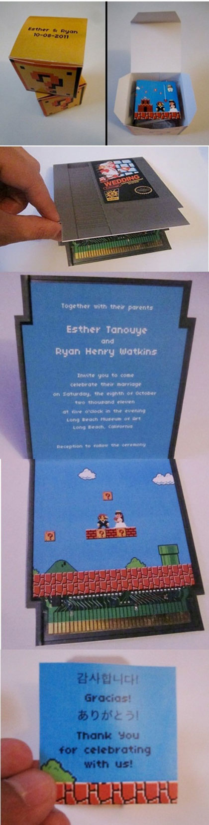 특히 이들의 청첩장과 감사카드 등은 슈퍼마리오 게임에 등장하는 물음표 상자에 담겨 있어 웃음을 자아냈다.