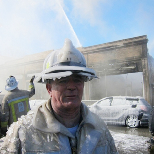 공개된 사진 속에는 온 몸이 얼어버린 소방관의 모습이 담겨있다. 소방관의 헬멧에는 고드름이 열려 있고 옷에는 얼음 알갱이들이 꽁꽁 얼어 붙어있다.