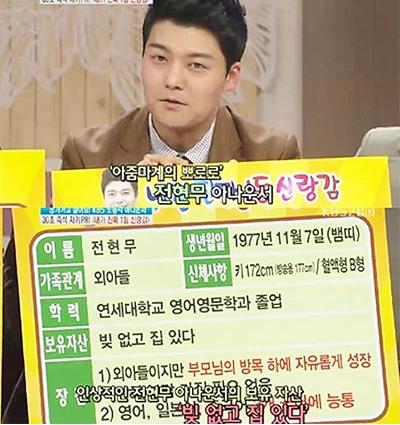 한편, 전현무는 이날 이상형 월드컵에서 스캔들이 났던 박은영 아나운서가 아닌 배우 성유리를 최종 이상형으로 꼽았다.