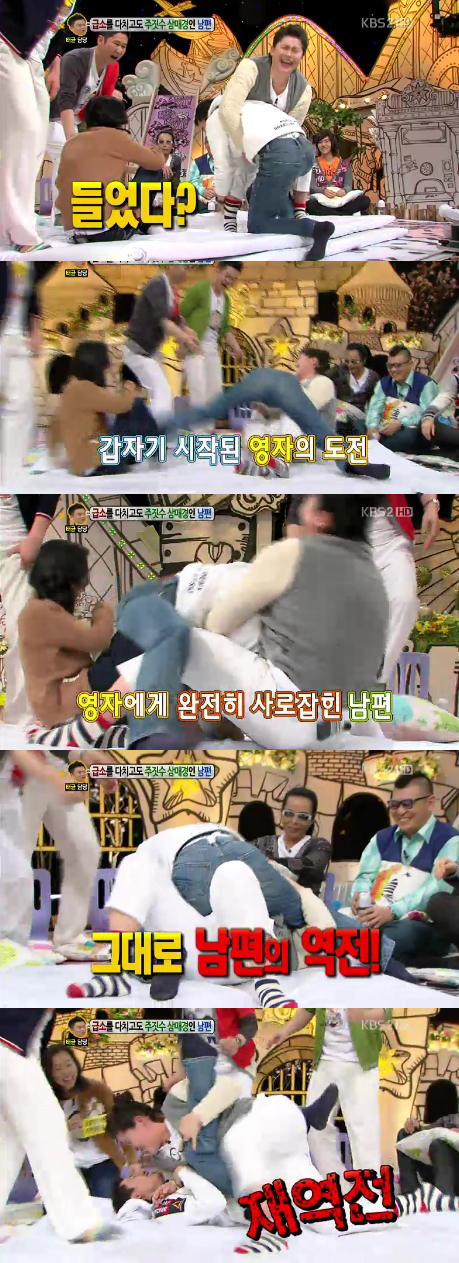 이날 스튜디오에서도 주짓수 중독남은 가녀린 아내를 상대로 기술을 걸다 MC 이영자가 주짓수 중독남을 들어올려 버렸다.