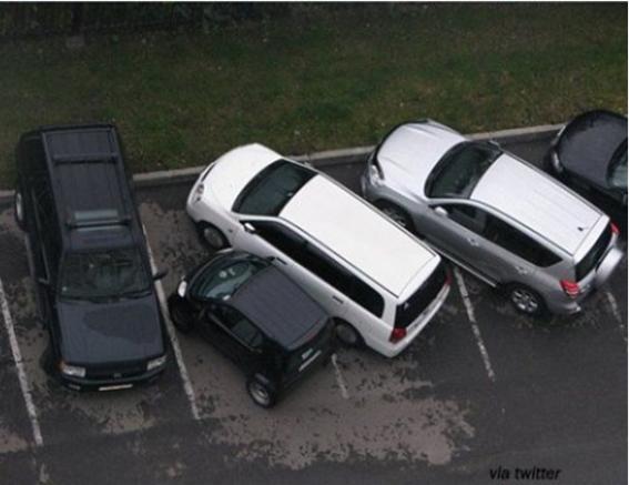 공개된 사진은 큰 차량들이 주차선을 침범해 주차를 해 놓자 소형차가 보란듯이 큰 차들 옆으로 끼어들어 주차했다.