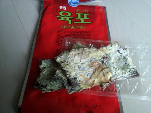 안에 든 내용물이 육포라는 것조차 전혀 알아 볼 수 없을 정도로 곰팡이가 심하게 퍼져 있었던 것.