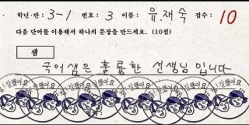 이에 이 초등학교 3학년생은 답을 "국어샘은 훌륭한 선생님입니다"라고 적었다.