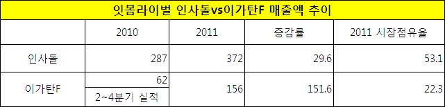 23일 제약업계와 의약품조사기관인 IMS헬스데이터에 따르면 동국제약 인사돌은 작년 한 해 동안 전년대비 29.6% 증가한 372억원을 기록했다. 반면 2010년 6월 8일 리뉴얼된 명인제약 이가탄F는 전년대비 151.6%(2010년 2~4분기 매출 집계) 늘어난 156억원의 매출을 달성했다.