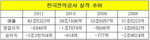 실제로 한전은 2007년부터 2010년까지 4년간 12조원의 부채가 늘어났다. 올해 예상 부채규모는 42조원이며 2015년에는 67조원으로 불어날 전망이다.