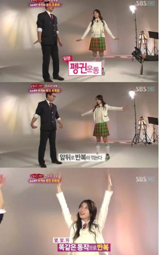 미쓰에이 수지가 자신만의 펭귄 운동법을 공개해 화제다.