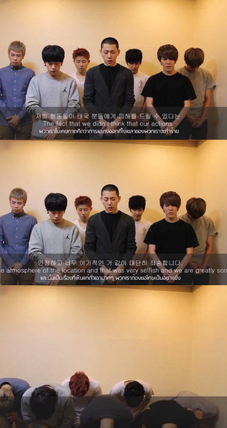 이번 영상은 한국어와 영어, 태국어 자막으로 제작됐으며 블락비 멤버들은 “저희가 최근에 태국에 가서 했던 모든 행동들에 대해 너무나도 죄송하다”며 허리를 90도로 굽혀 용서를 구했다.