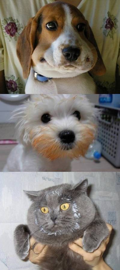 또 다른 사진에는 강아지 입 주변에 먹은 흔적을 잔뜩 묻혀놓고 마치 자신이 먹지 않은 것처럼 순진한 눈으로 쳐다봐 폭소케 했다.