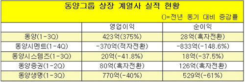 다만 그룹 전체 부채가 1조7천억원인 데다 대다수 계열사들의 바닥 실적을 보이고 있어 동양의 선전은 큰 힘이 되지 못하는 상황이다. 그룹의 부채비율도 500%를 넘어섰다.