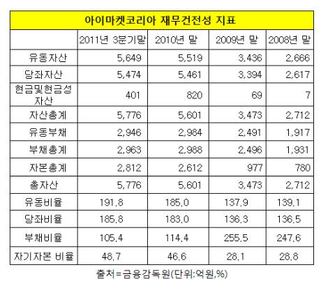아이마켓코리아의 2011년 3분기 말 기준 자본총계는 2천812억원, 부채총계는 2천963억원이다. 이로서 자본구성의 건전성 여부를 판단하는 대표적인 지표인 부채비율은 105.4%다.