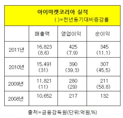 아이마켓코리아의 지난해 매출액은 1조6천823억원으로 전년 동기대비 8.6% 늘어났다. 같은 기간 영업이익과 순이익은 425억원, 345억원으로 각각 전년 동기대비 7.9%, 11.1% 증가했다. 외형과 내실 모두를 야무지게 챙겼다.