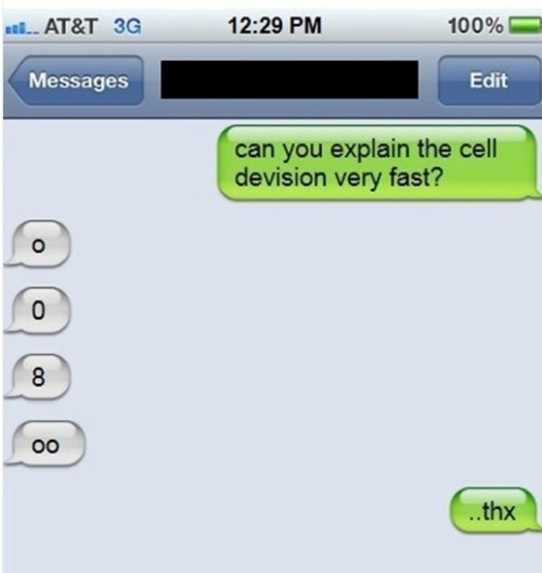 공개된 사진은 스마트폰에서 주고받은 문자를 캡처한 것으로 한 사람이 “빠르게 세포분열에 대해 설명할 수 있냐?(can you explain the cell devision very fast?)”고 묻는다.