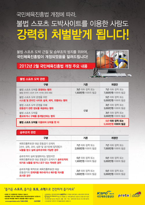 개정안에 따르면 불법 스포츠도박 사이트의 운영자는 물론 이를 설계․제작․유통하는 자, 홍보나 불법 배팅을 알선하는 자까지 처벌하며, 불법 스포츠도박 사이트를 통해 배팅한 경우에도 5년 이하 징역이나 5천만 원 이하의 벌금에 처하도록 처벌을 강화했다.