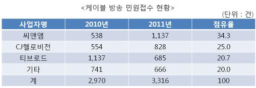 사업자별로는 씨앤앰(34.3%), 티브로드(20.7%), CJ헬로비전(2%) 3개 사업자가 전체 케이블방송 민원의 80%를 차지했다.