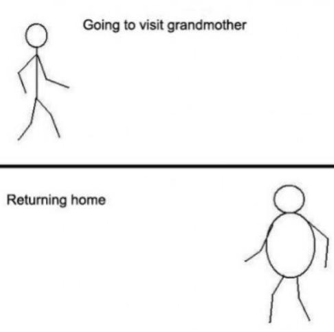 내용을 보면 할머니 집에 갈 때는 날씬한 모습이었지만, 집으로 돌아올 때는 뚱뚱한 모습이다.