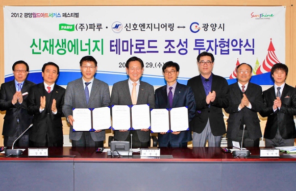 광양시는 신재생에너지 전문기업인 ㈜파루(대표이사 강문식)와 ㈜신호엔지니어링(대표이사 임수연)과 2012 광양월드아트서커스 페스티벌 행사장에 신재생에너지 테마로드 조성을 위해 2억1천300만원을 투자하기로 하는 양해각서(MOU)를 29일 시청 상황실에서 체결했다.