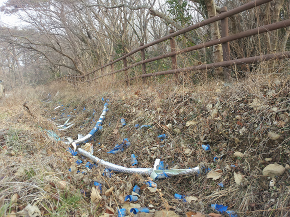 정도리 탐방안내소의 목책 주변에는 파이프 보온재의 잔여물이 널려 있어 쓰레기장을 방불케 하고 있으나 수개월 동안 방치되어 탐방객들의 원성을 사고 있다.