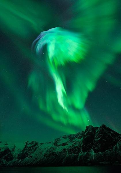 불사조가 밤하늘을 날아오르는 듯한 형상을 띠는 오로라가 포착돼 눈길을 끌고 있다.