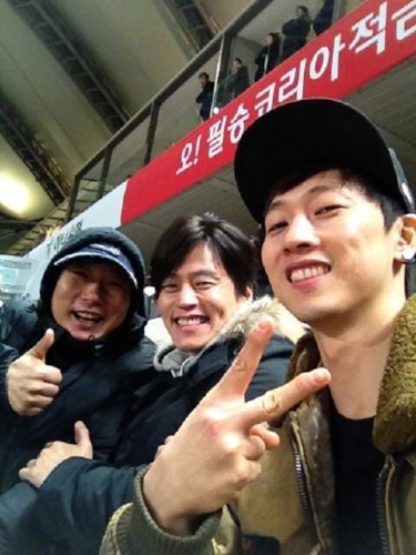 쿠웨이트전이 끝나자 장우혁은 “오늘 절친 '1박2일’ 팀이 응원 와서 그런지 동국 근호 각각 한 골씩 뽑아주네요. 아 뿌듯해”라고 즐거워했다.(사진=장우혁 트위터)