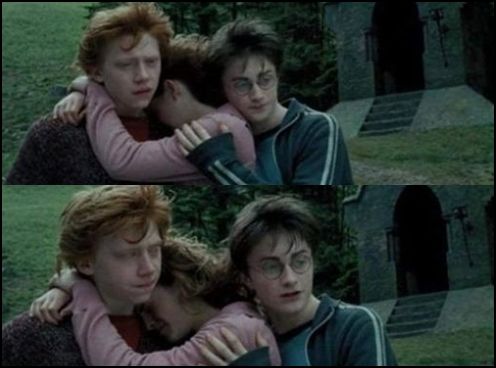 특히 론은 헤르미온느의 애정신을 방해하는 해리포터를 마치 째려보듯이 처다봐 웃음을 자아내고 있다.