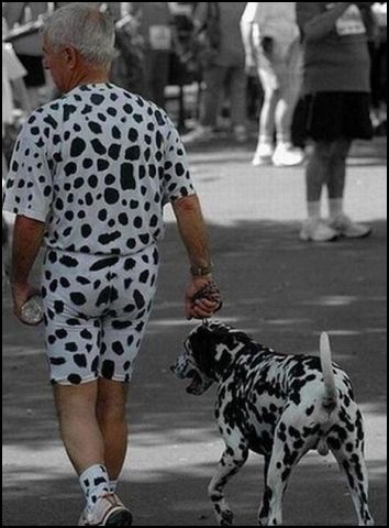 사진 속에는 한 외국인 남성이 애견 달마시안과 비슷한 무늬가 새겨진 의상을 착용하고 산책에 나서는 모습이 담겨 있다. 이 남성은 자신의 강아지 달마시안처럼 비슷한 의상과 심지어는 양말까지 착용해 '커플룩 종결자'로 등극했다.