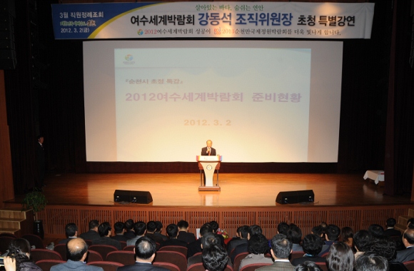 순천시는 2일 문화건강센터에서 여수엑스포 조직위원장을 초청해 2012여수세계박람회 성공기원과 정원박람회의 완벽한 준비를 위한 특별 강연회를 가졌다.
