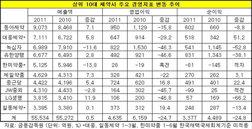신종플루 특수가 사라진 녹십자는 감소폭이 가장 컸다. 매출액은 11.6% 줄어든 6천989억, 영업이익과 순이익은 각각 46.3%와 52.8% 급감한 822억과 541억원에 그쳤다.