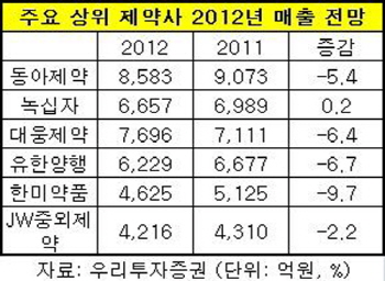 우리투자증권은 올해는 녹십자를 제외한 상위 대부분 제약사의 매출액마저 감소할 것으로 어두운 전망을 내렸다. 녹십자 7천696억으로 0.2% 성장하고 나머지는 모두 영업익은 물론 매출까지 뒷걸음질 칠 것으로 전망했다. 동아제약 8천583억(-5.4%), 한미약품 4천625억(-9.7%), 종근당 4천276억(-3.3%), 유한양행 6천229억(-6.7%), 대웅제약 6천657억(-6.4%), JW중외제약 4천216억원(-2.2%)등이다.